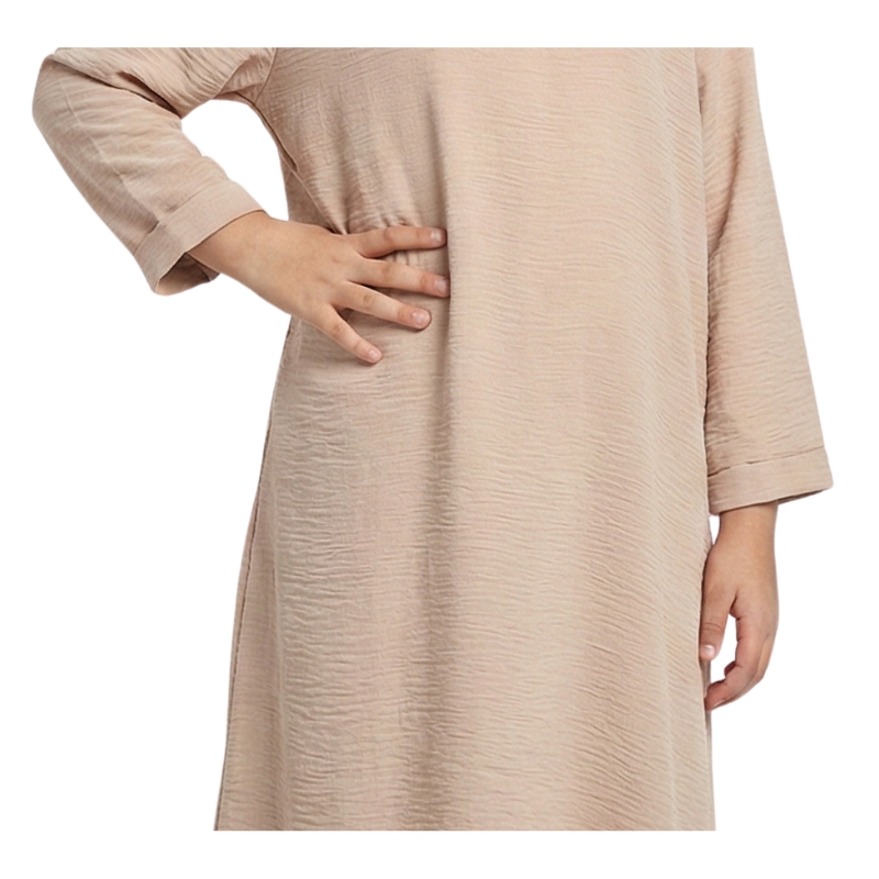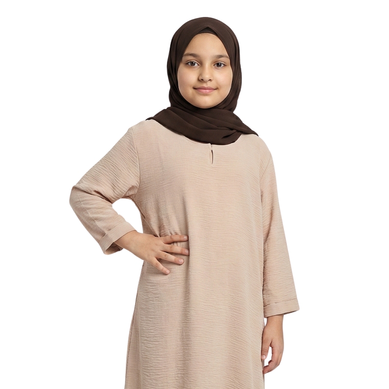 This premium abaya set for girls is a complete ensemble designed for elegance and modest coverage. Crafted from high-quality textured crepe fabric, the garment features a distinct, subtle “crinkle” texture that offers a sophisticated look while remaining lightweight and breathable for all-day comfort.