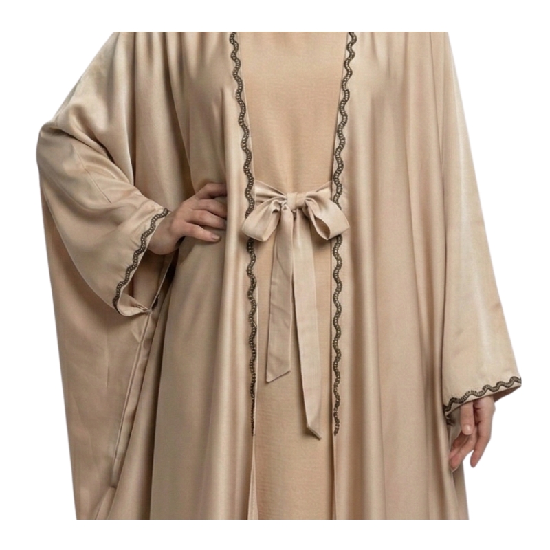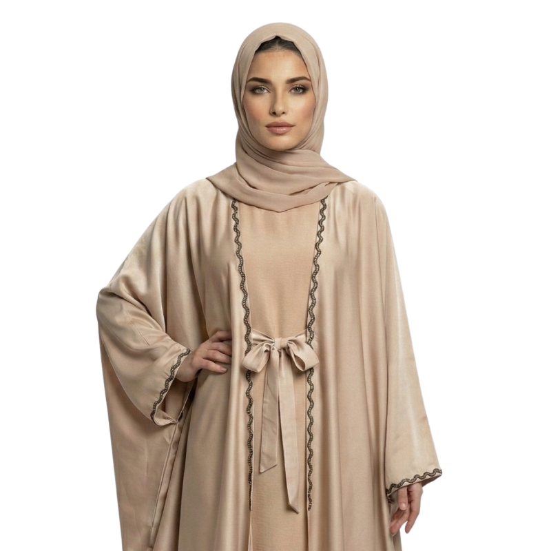 The design is elevated by intricate details, featuring a delicate, wavy silver beaded trim that runs along the full length of the front opening and adorns the wide cuffs. This subtle shimmer adds a refined touch of glamour without overpowering the minimalist aesthetic. The abaya comes with a matching fabric belt, giving you the option to cinch the waist for a more structured, tailored silhouette or wear it open and loose for a relaxed, airy feel.