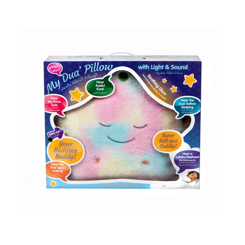 The original dua star pillow now in Candyfloss Special Edition. One of the best-selling Islamic toys. My Dua Pillow is a beautiful islamic gift for your child. The pillow glows and is packed with night-time dua and supplications. Your child will love listening to these, and will surely benefit from listening to the prayers. and learning their nighttime dua’s/supplications with Tajweed. Also includes a soothing lullaby to make bedtime easier, and fun!